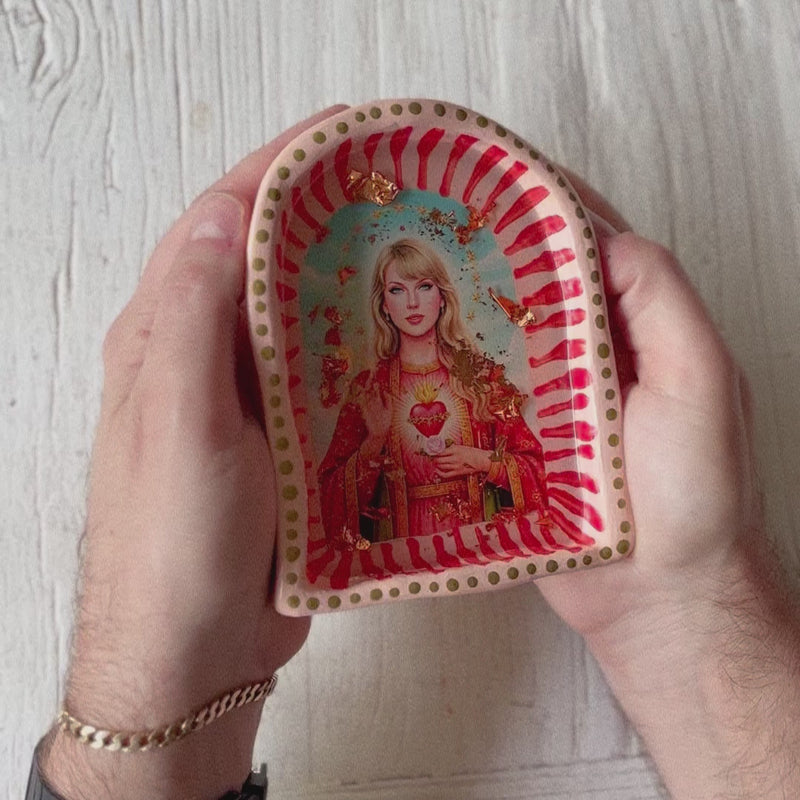 Individually hand-made Taylor Is A Shrine piece by A Boy Named Aaron. A mixed media wall art piece, featuring a hand painted border & rose gold leafing with a resin inlay. This tile comes ready to hang on your wall with a hook on the back.