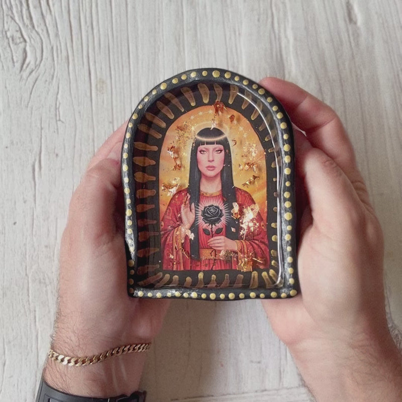 Individually hand-made Gaga Is A Shrine piece by A Boy Named Aaron. A mixed media wall art piece, featuring a hand painted border & rose gold leafing with a resin inlay. This tile comes ready to hang on your wall with a hook on the back.