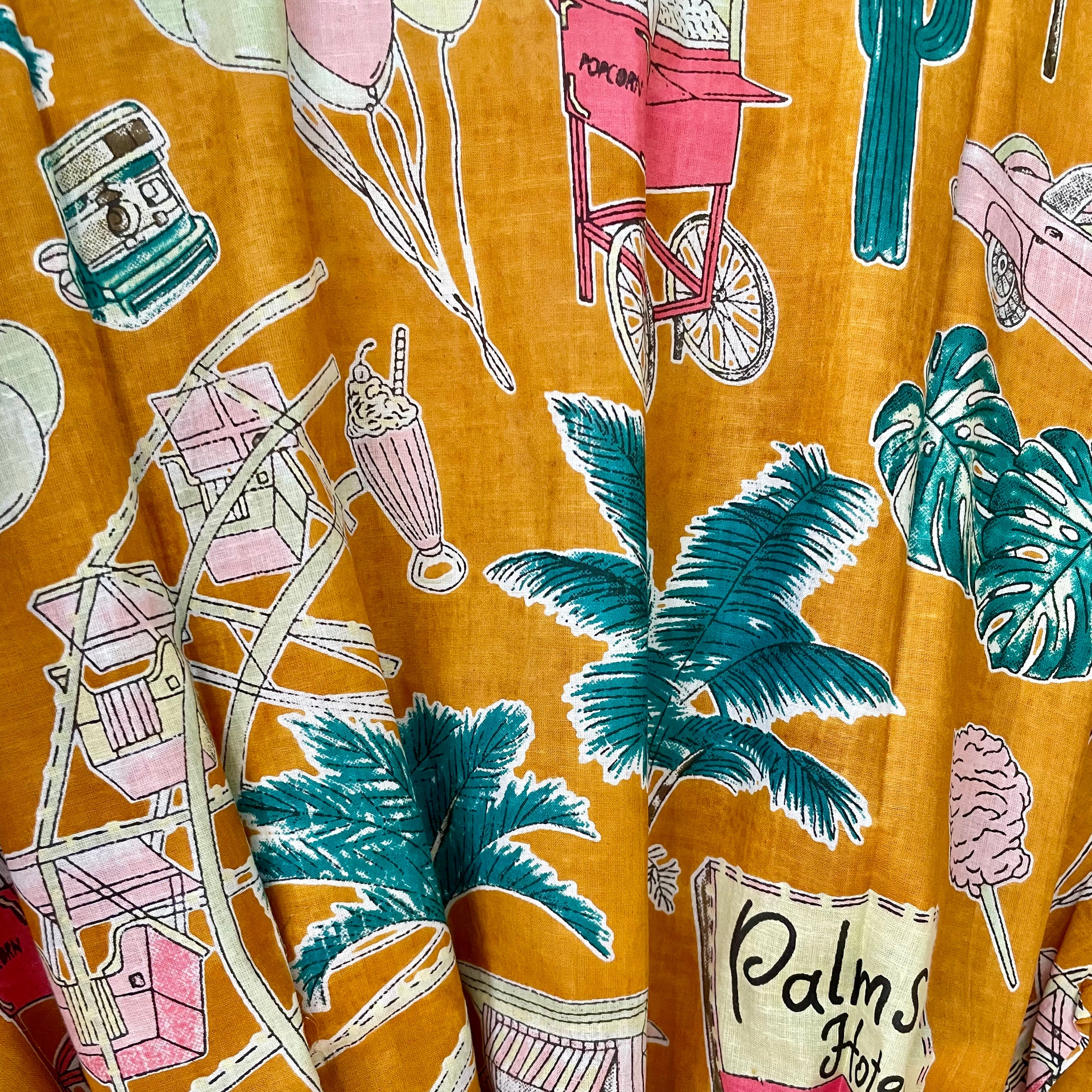 Individually hand-made Carnival Luxe Robe - Sienna. Relax in luxury, lovingly made of 100% lightweight cotton, featuring overall Palm Springs carnival pattern, waist tie, pockets and a flared collar with piped edging. All robes are a 'free-size' garment, refer to the fitting size below.