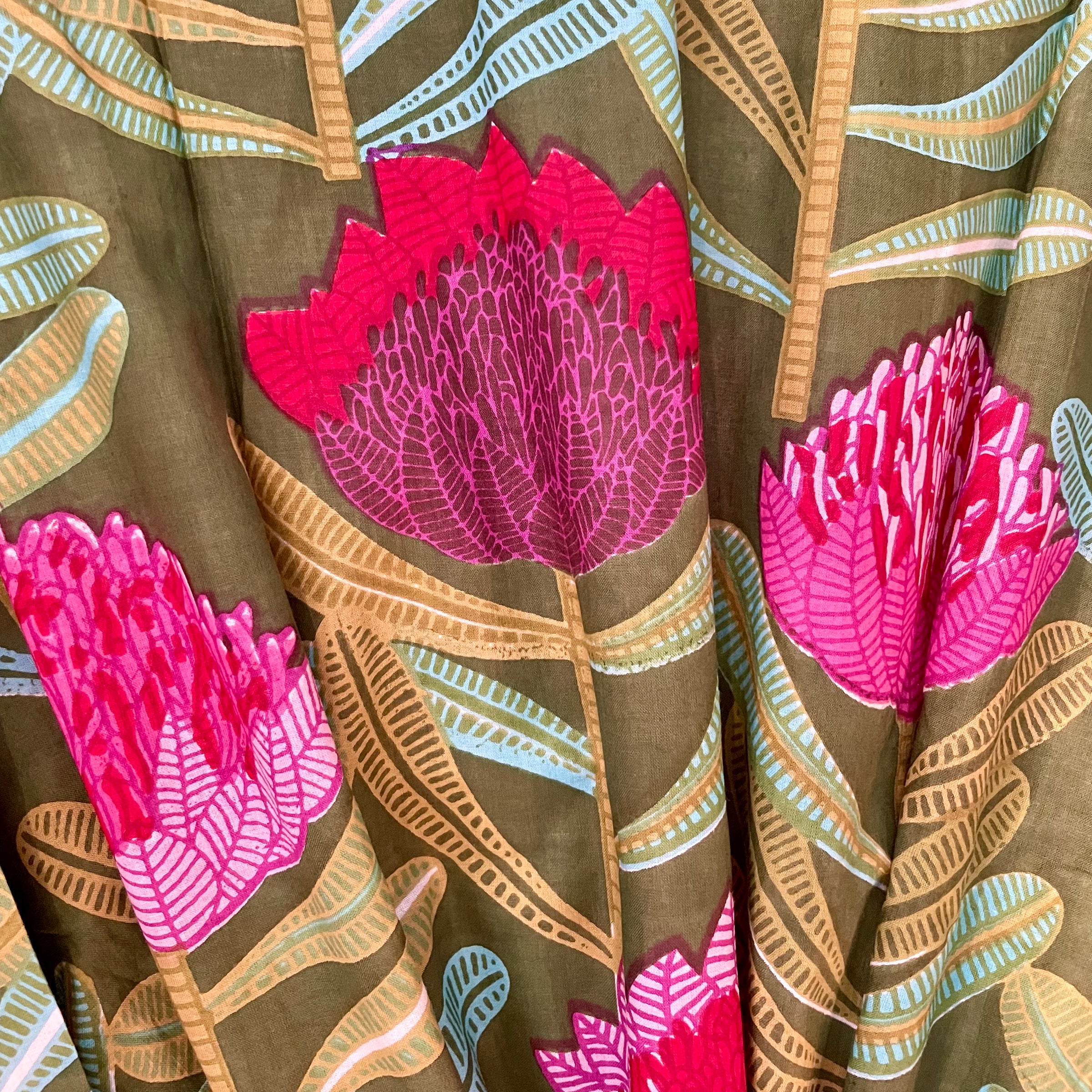 Individually hand-made Protea Luxe Robe - Olive. Relax in luxury, lovingly made of 100% lightweight cotton, featuring overall protea floral pattern, waist tie, pockets and a flared collar with piped edging. All robes are a 'free-size' garment, refer to the fitting size below.